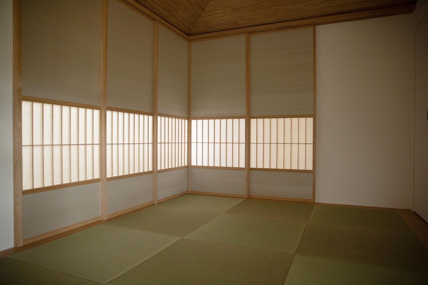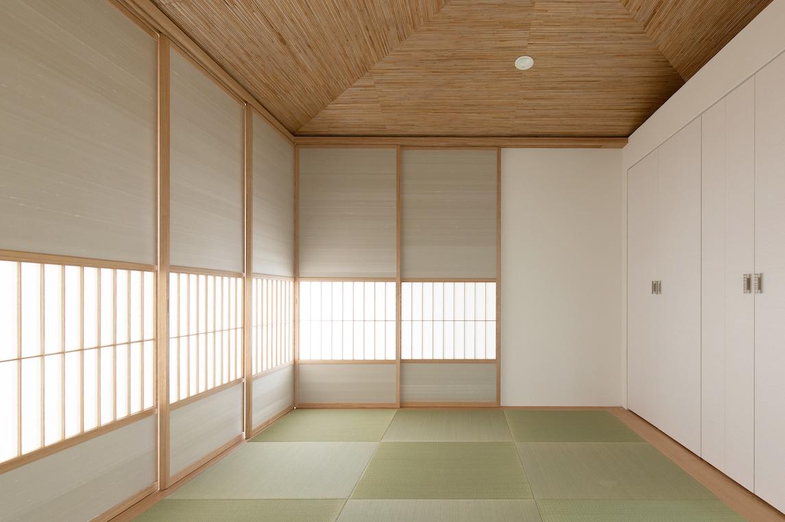 銀鼠色のしけ絹紙を使用。和の空間でありながら銀鼠色の襖がモダンに馴染み、自然素材の襖が空間の境界をやさしく調和させている。