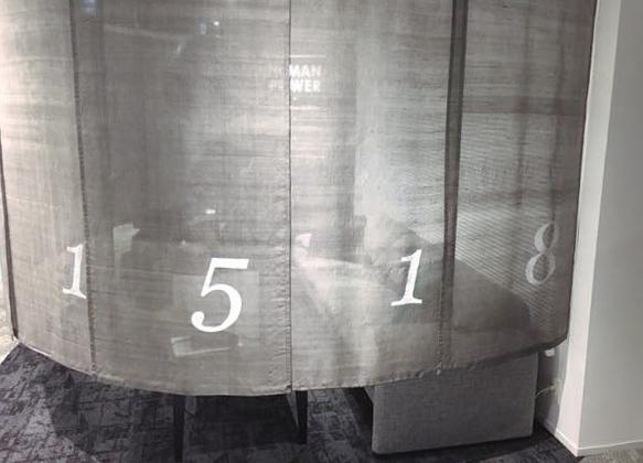 麻炭で染色したしけ絹を、パーテーションに使用。絹が光をまるくし空間を包み込む。麻炭とともに空気を清浄化し、程よい透け感があるので、プライバシーを守りながらも圧迫感がない心地よい空間ができる。