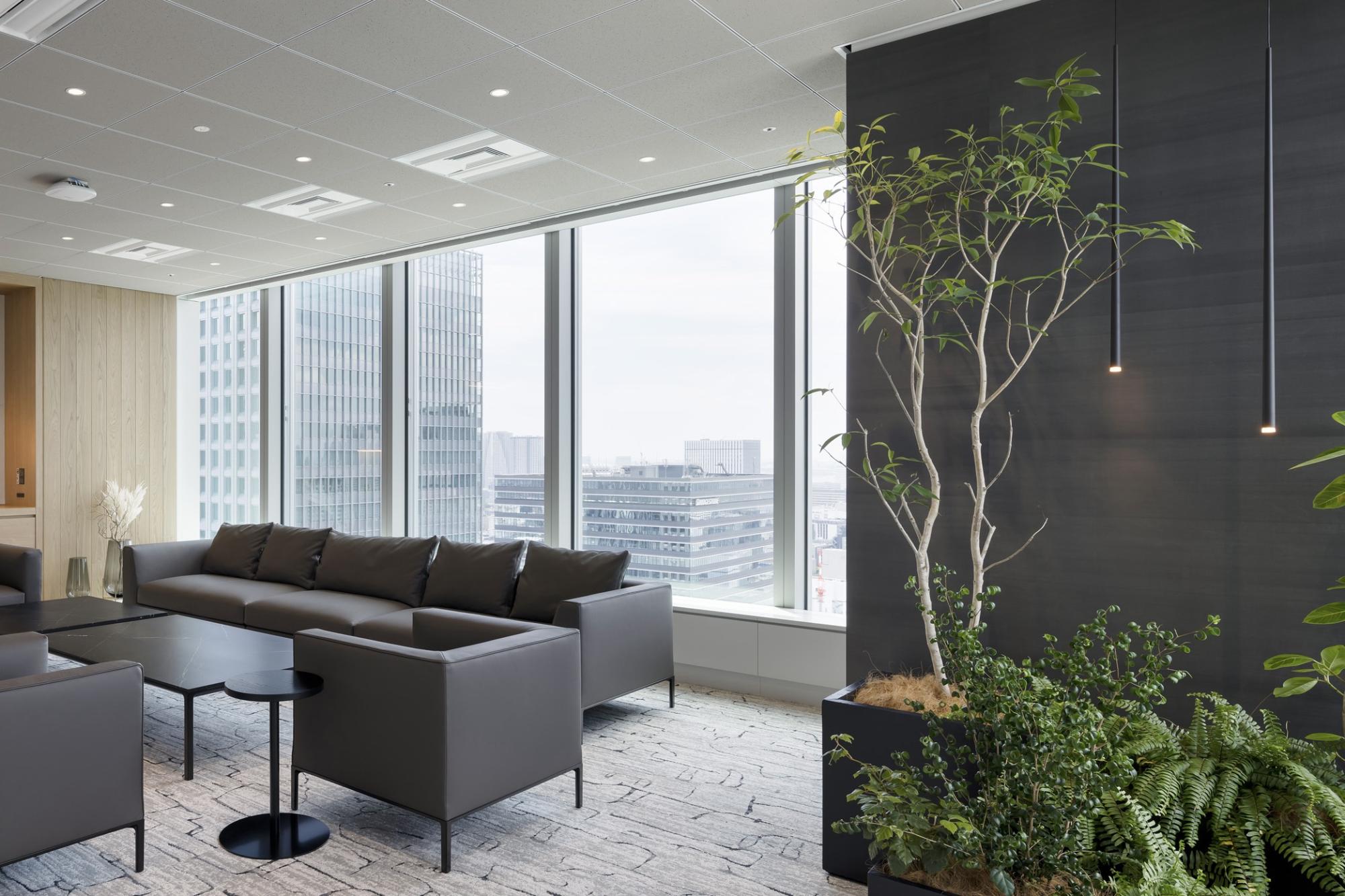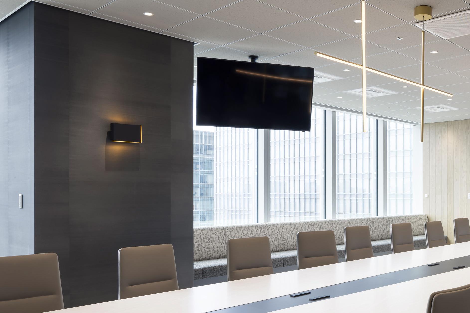 備長炭の断面を思わせる深い炭色と上品な光沢を表現。絹が自然光や照明を柔らかく拡散させ、会議室を落ち着きと品格のある空間へと演出している。