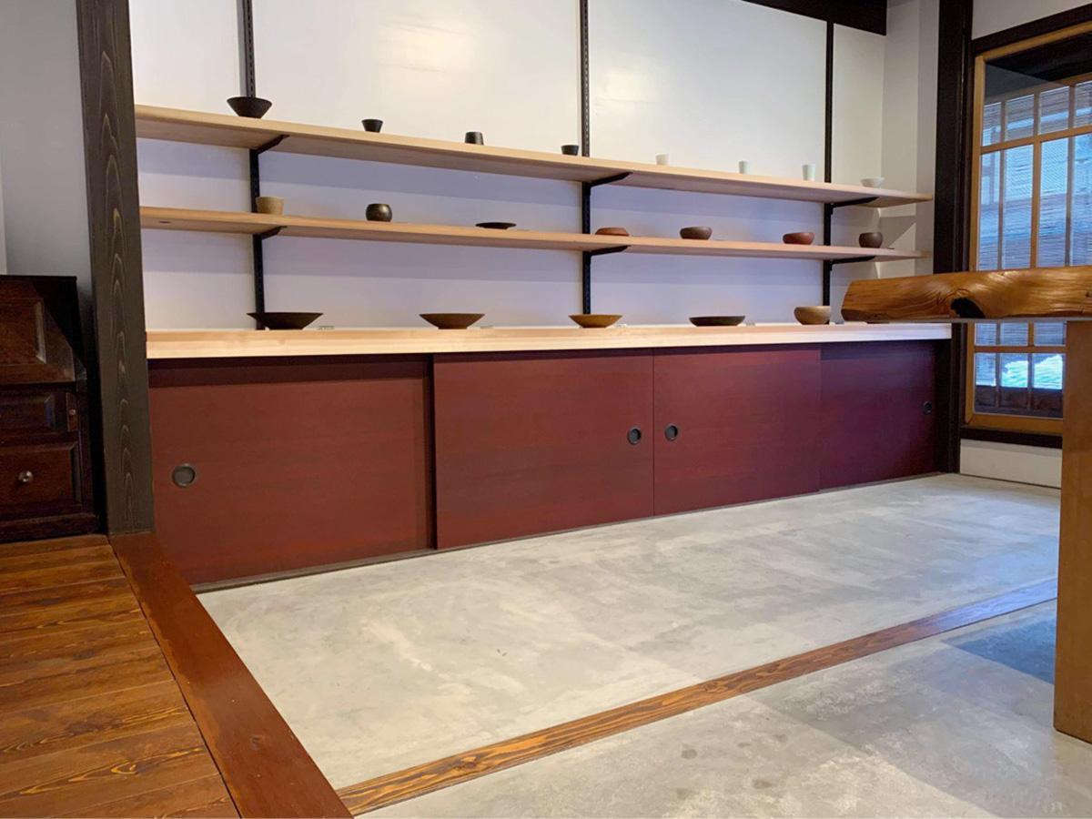 店舗入口正面には特注の鮮やかなイエロー、奥には寒色系グレーのしけ絹壁紙を使用。