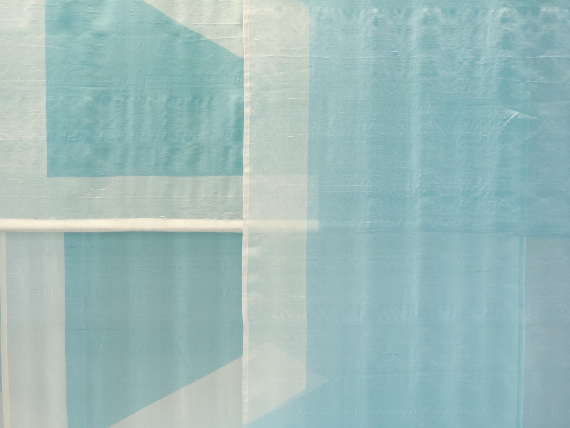 しけ絹を繊細なグラデーションに染め上げた、特注のレイヤータペストリー。 透過性のある生地を幾重にも重ねることで、白抜きされたロゴが奥行きの中に静かに浮かび上がる。 しけ絹特有の光沢と透け感が複雑に重なり合い、訪れる人々を上質な空気感で迎える、品格あるエントランス空間を演出。