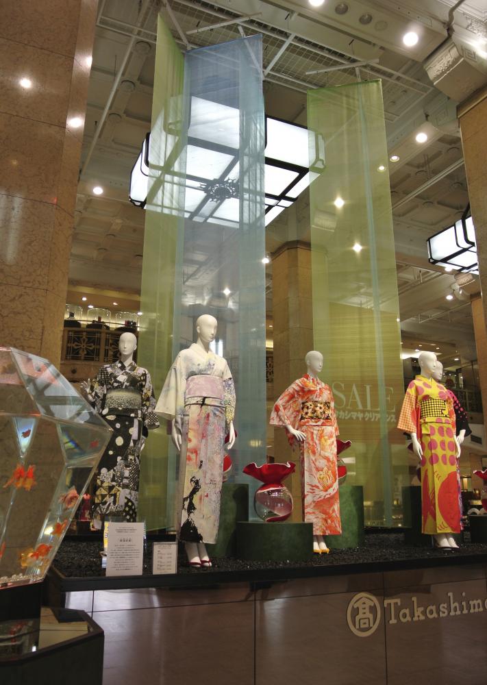 春を思わせるやわらかな色のしけ絹としけ絹紙を空間演出の素材として使用。5.6mものしけ絹は圧巻ながらも手前の展示物の邪魔にならない。寧ろ空間の質を上げて引き立てる役割を担ってくれる。後ろのライティングも和らげてくれる効果がある。