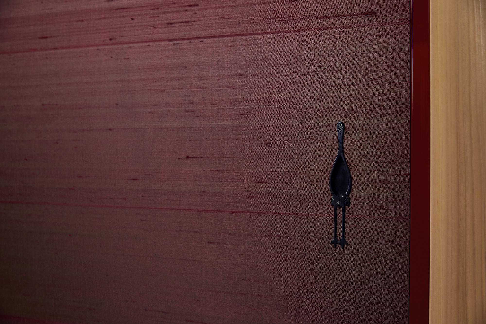 葡萄色のしけ絹紙を襖地として使用。光の当たり方によって赤に見えたり、緑に見えたりする葡萄色。存在感がありながらも空間になじむすごみがある。