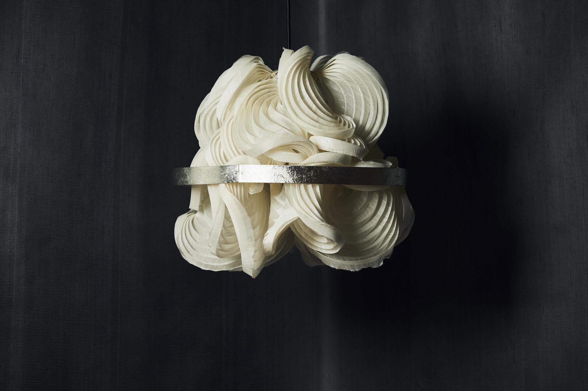 プリーツ加工したしけ絹を組み合わせたランプシェード。点灯時は幾重にも重ねられたしけ絹の陰影が華やかさを演出。消灯時にも絹の装飾が作品のように空間を演出しています。