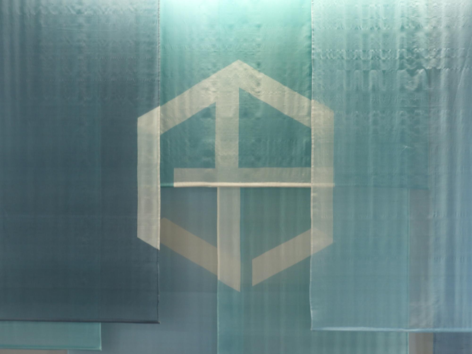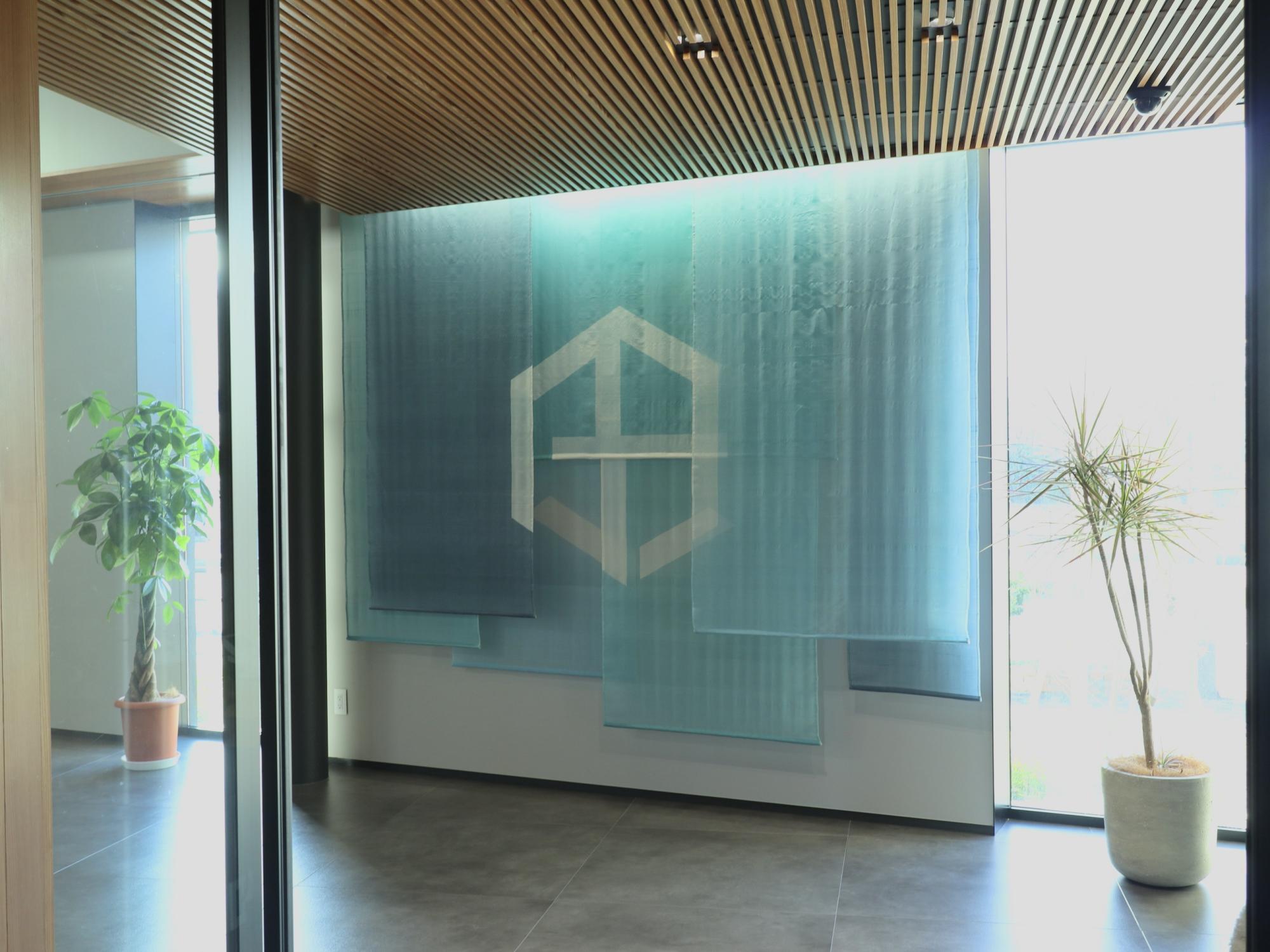 しけ絹を繊細なグラデーションに染め上げた、特注のレイヤータペストリー。 透過性のある生地を幾重にも重ねることで、白抜きされたロゴが奥行きの中に静かに浮かび上がる。 しけ絹特有の光沢と透け感が複雑に重なり合い、訪れる人々を上質な空気感で迎える、品格あるエントランス空間を演出。
