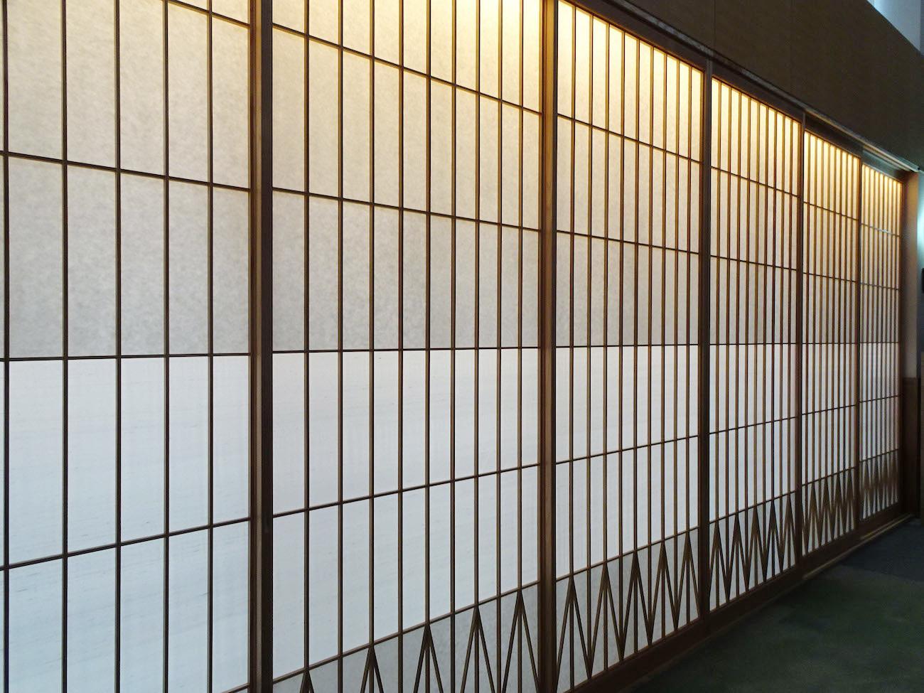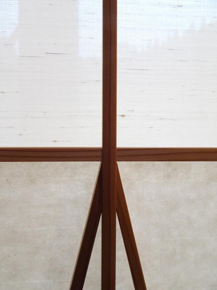 しけ絹を貼り合わせた建具。上下には五箇山和紙が採用され、地場産の絹と和紙が外の光を柔らかく室内に取り込んでいる。しけ絹を通した光は木漏れ日のようにやさしく室内に降り注ぐ。